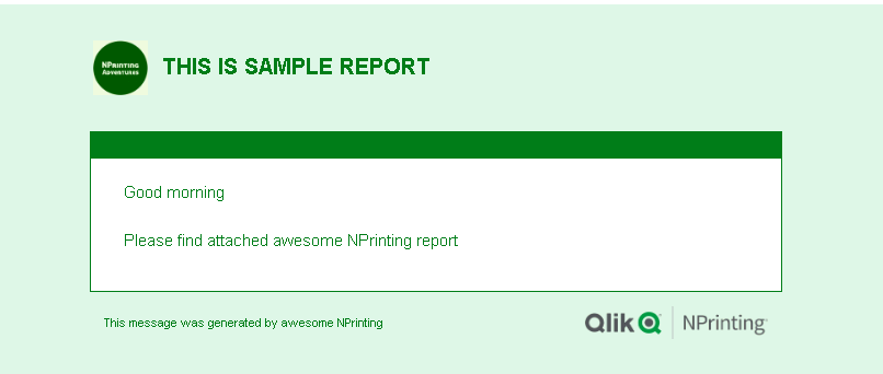 I needed well formatted HTML email content. To achieve this I had to build it and then embed it in email body. NPrinting does not allow to embed external files directly in email content editor, however it allows to embed HTML NPrinting reports. My solution is based on this approach. I have created my email content and I am almost ready to embed it. The last bit I need to do is to include some branding (logos/images).