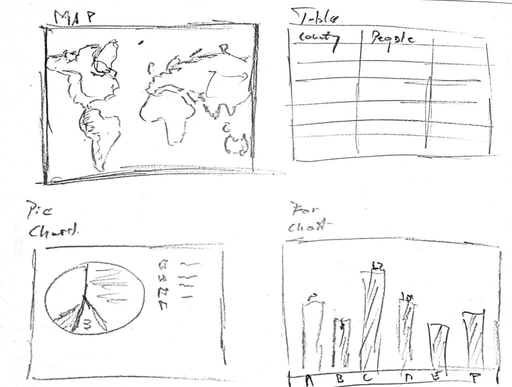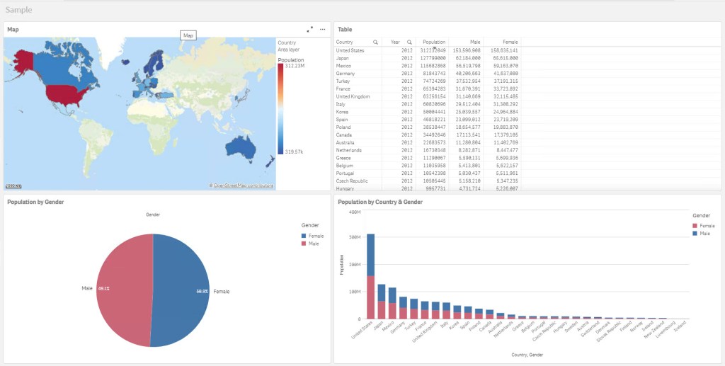 For Map, Table and Stacked Bar Chart I used single Qlik Sense table with Country dimension and measures: Sum(Population), Sum({<Gender={Male}>}Population) and Sum({<Gender={Female}>}Population) measures. Now here are the arrays for HTML charts: