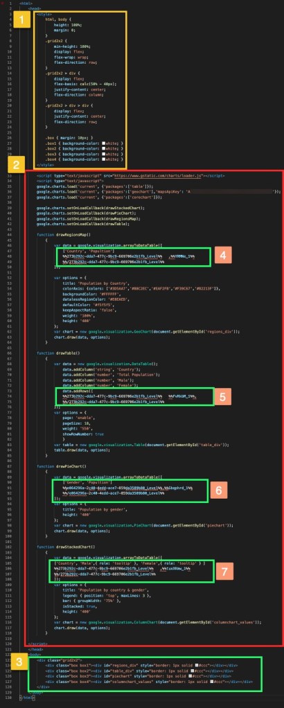 Looking at the code above you can see that data we will need to be populated dynamically is in [‘Country’, ‘Popularity’] arrays. We will stick to basic map settings for simplicity purposes.